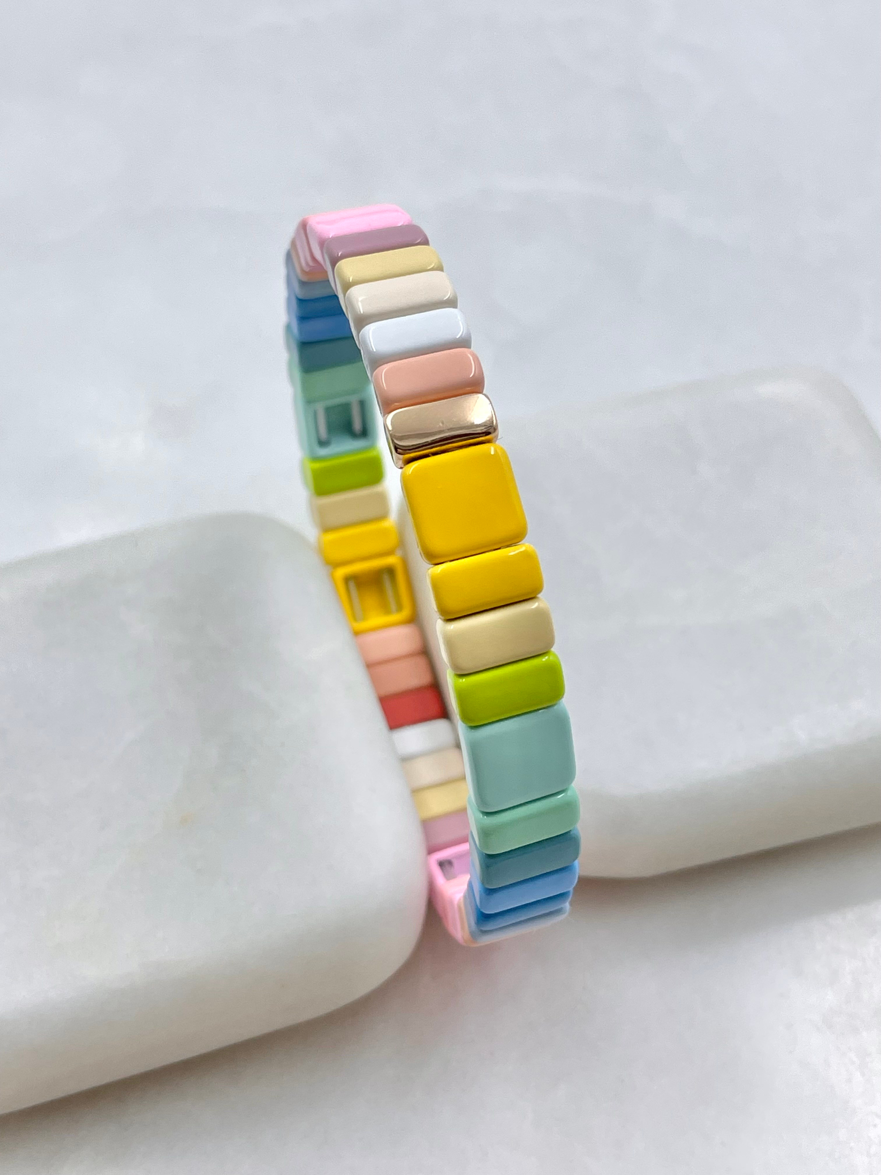 Altın Kaplama Kare Model Porselen Esnek Bileklik Renkli