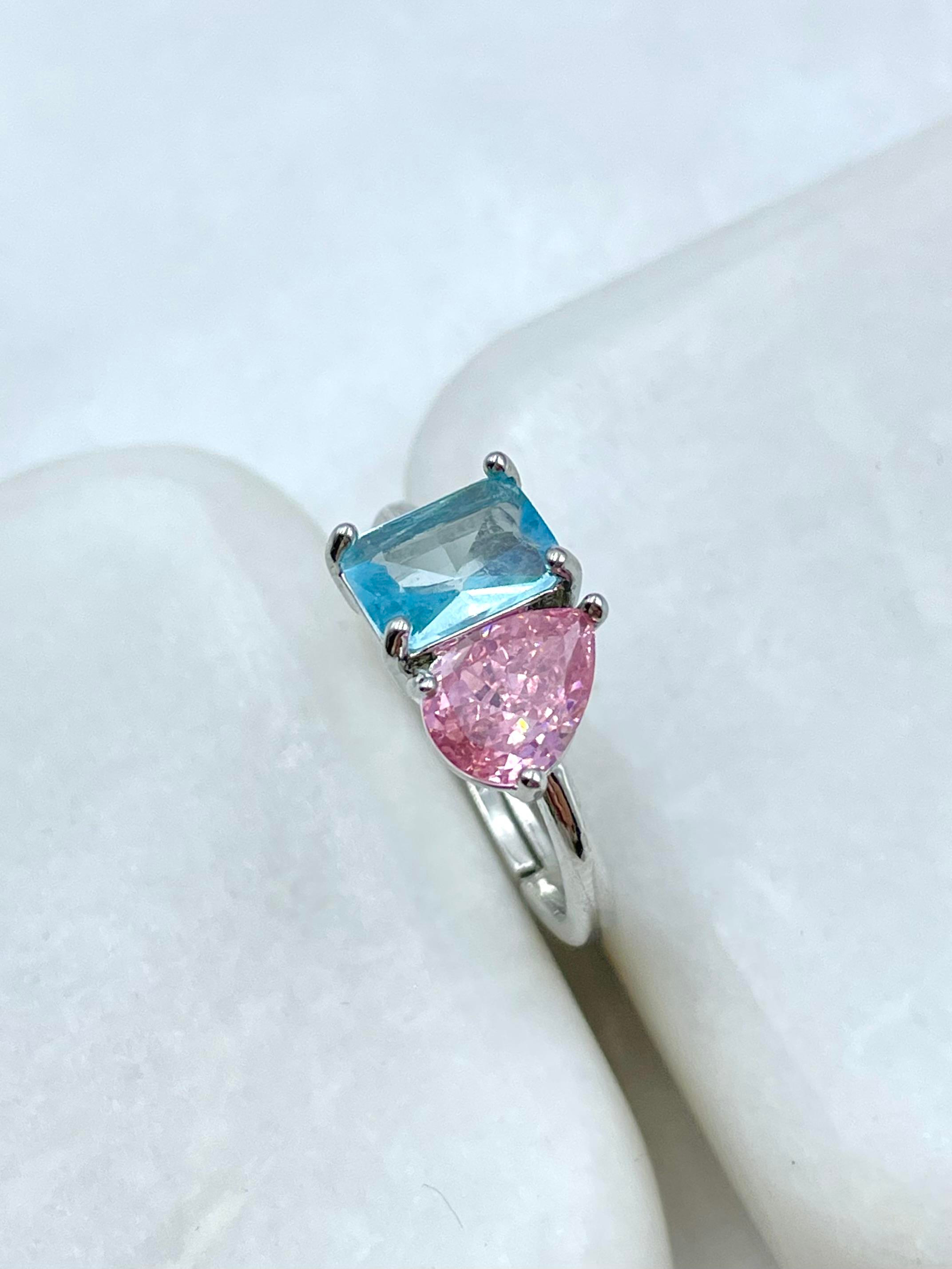 Altın Kaplama Kare ve Üçgen Kristal Taşlı Yüzük Mavi-Gümüş (20448)