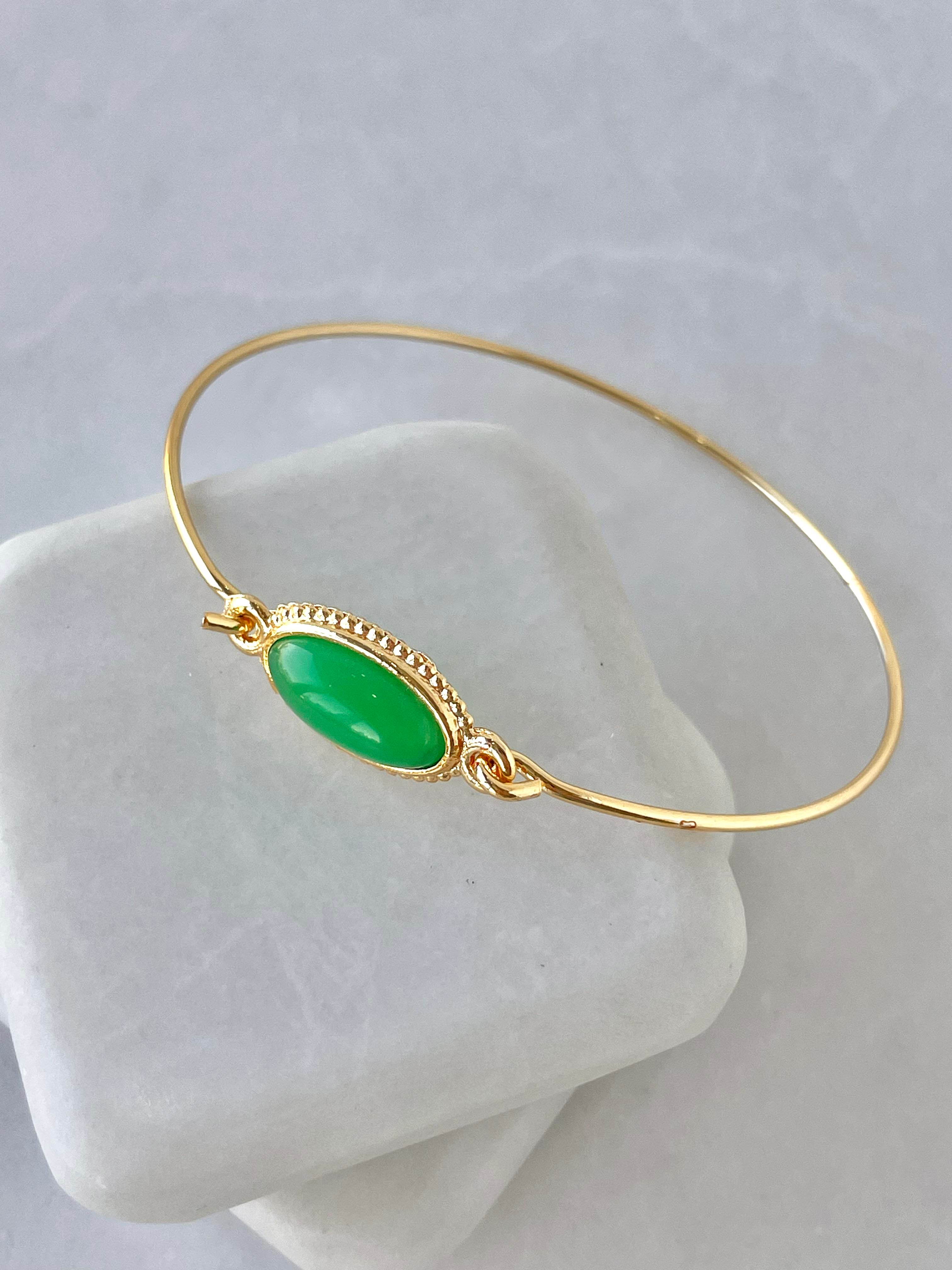 Altın Kaplama Oval Taşlı Kelepçe Bileklik Yeşil
