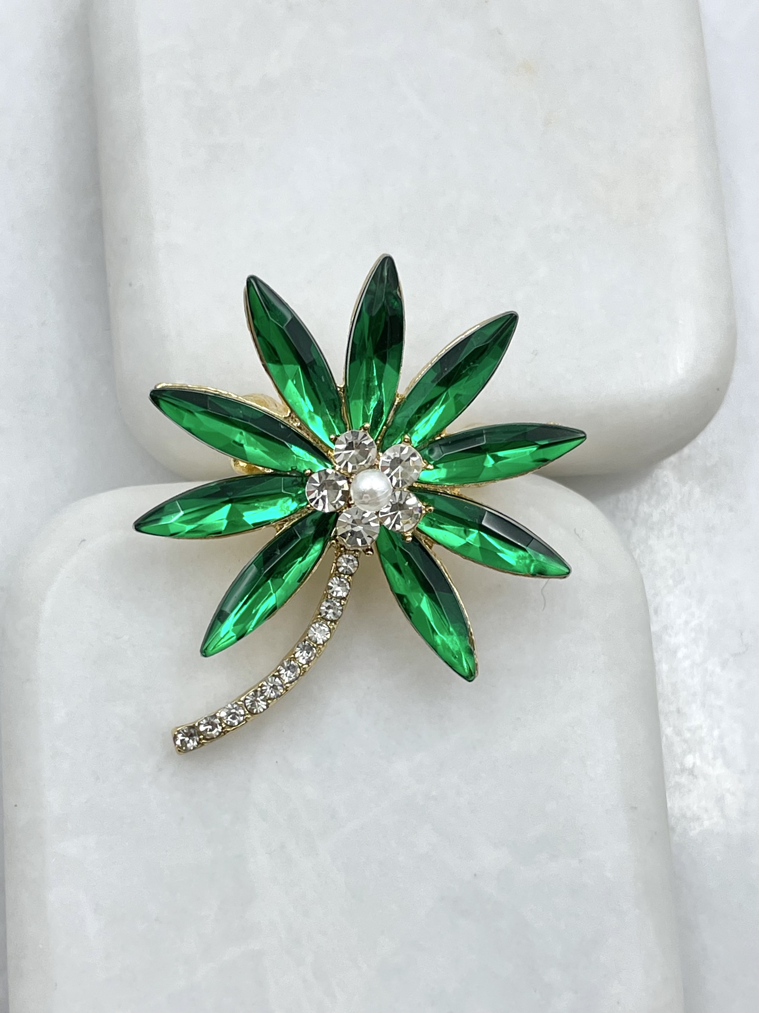 Kristal ve Gömme Taşlı Çiçek Broş Yeşil (22552)