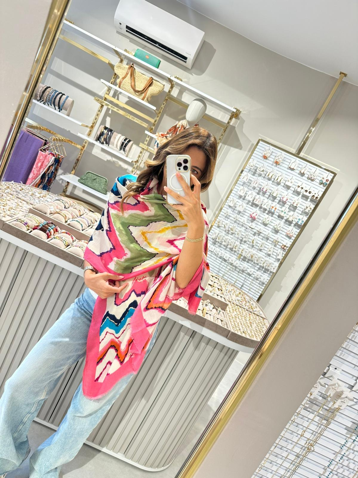 Zigzag Desenli Varaklı Pembe Şal Renkli