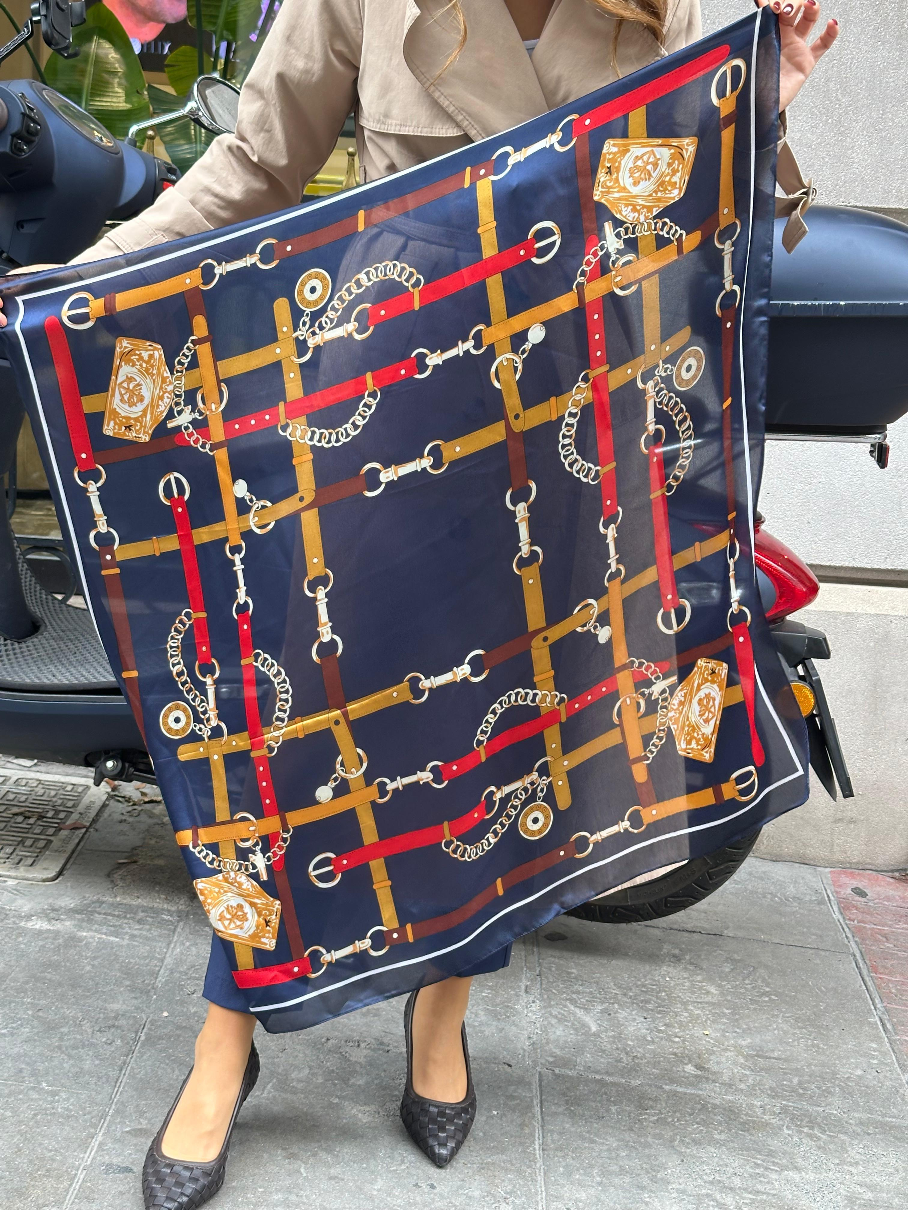 Zincir Desenli Lacivert Fular 90 x 90 cm Renkli (20627)