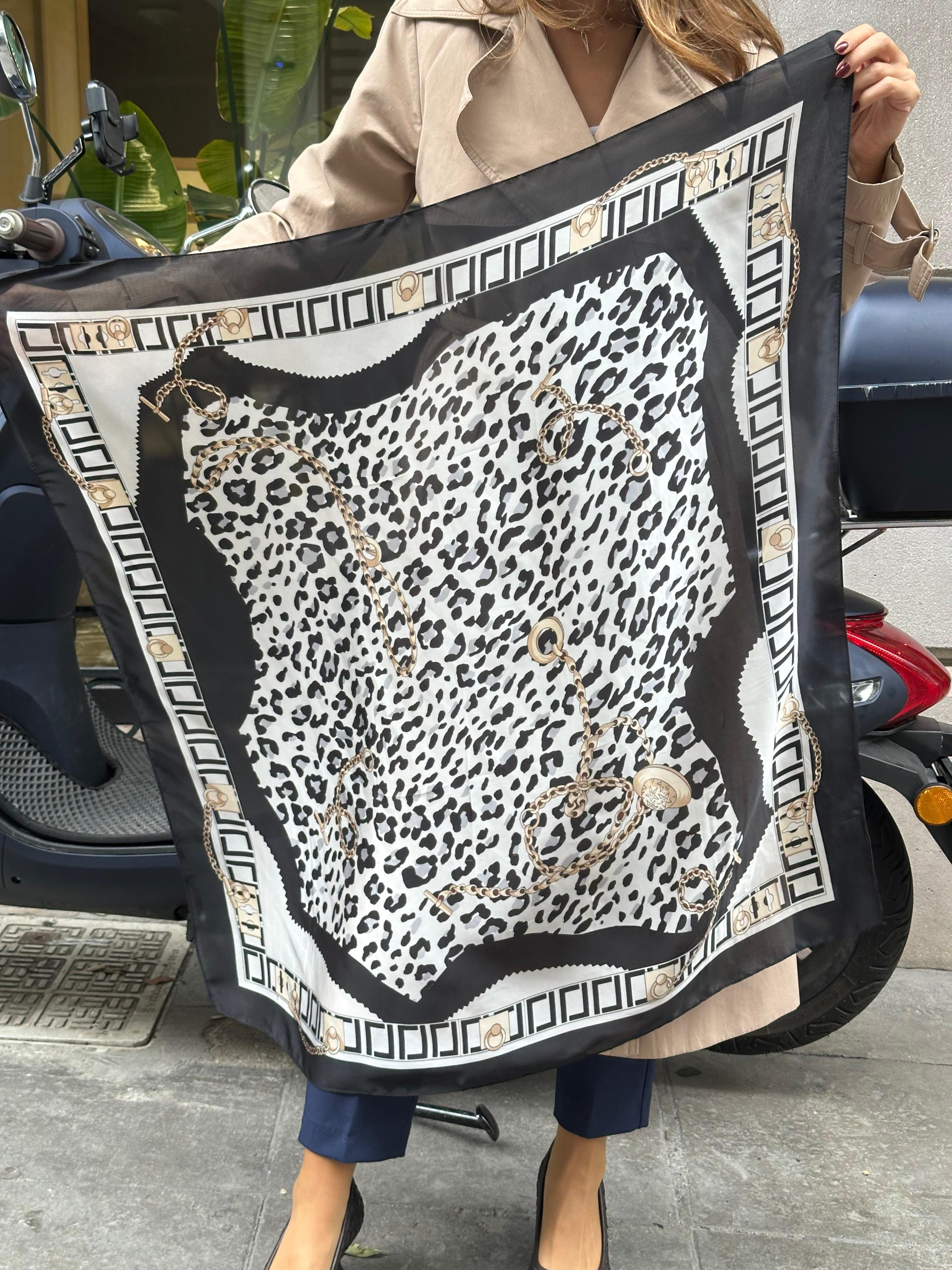 Zincir ve Leopar Desenli Siyah Fular 90 x 90 cm Renkli (20628)